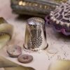These thimbles are entirely hand-made by my silversmith Adam Mills. They are designed to fit inside the Stuart Thistle Étui embroidery kit. Each is hand-engraved with an image of the Thistle Étui.
